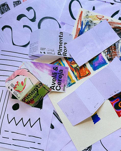 Optei por essa abordagem em todas as etiquetas, rótulos, embalagens. Me limitei a apenas uma linha de produtos limitados a criar dessa forma, uma linha onde a dona da marca cria as velas em cimento, e os rótulos limitados dessas velas terão essas explorações visuais com diversos materiais e não técnicas.